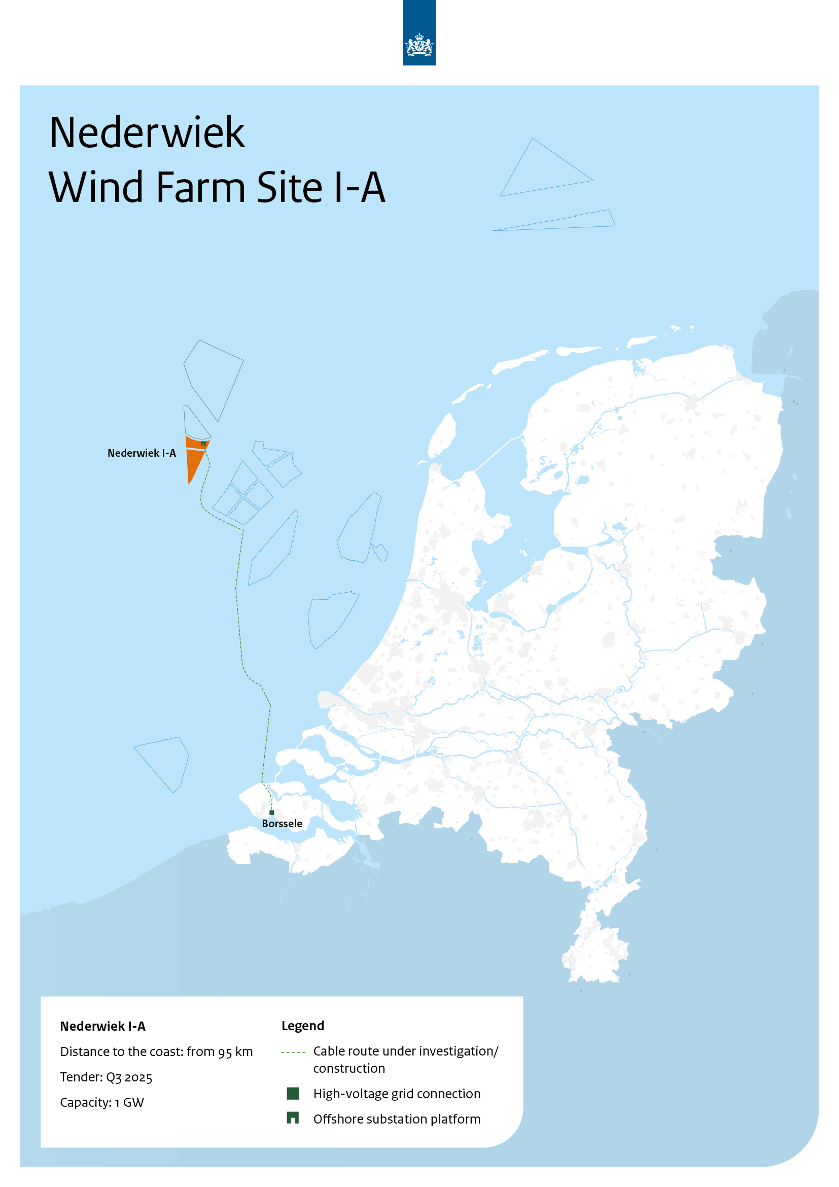 Offshore wind energy is indispensable in our current and future energy system. It is a relatively affordable and highly scalable source of clean energy. The Government has therefore designated Site Nederwiek I-A for the next offshore wind farm. This wind farm will have a capacity of 1 gigawatt (GW), which accounts for about 3.5% of Dutch electricity consumption.